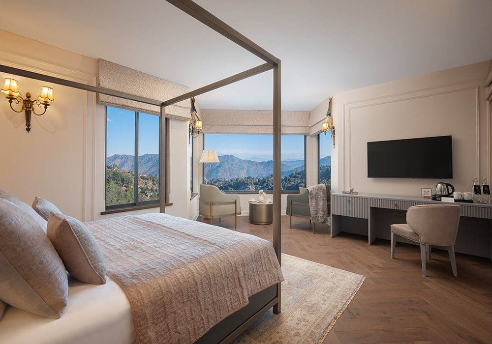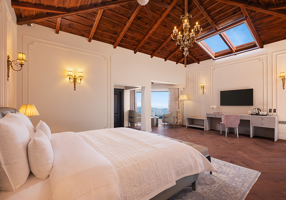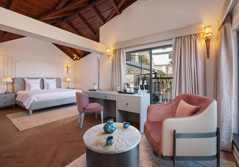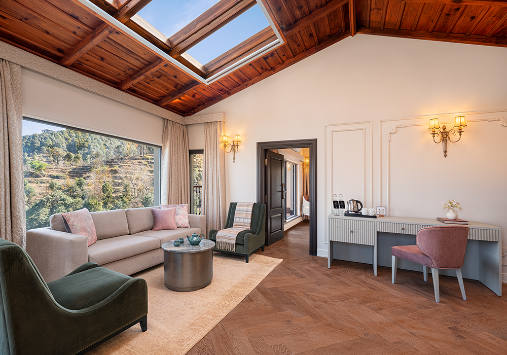 At 850 sq. ft., the most expansive offering, with both mountain and valley views. Featuring a private balcony and skylights in both the bedroom and living room, it blends indoor elegance with an immersive Himalayan setting.