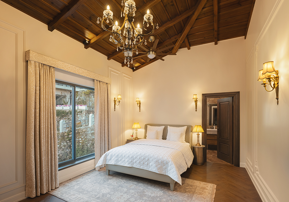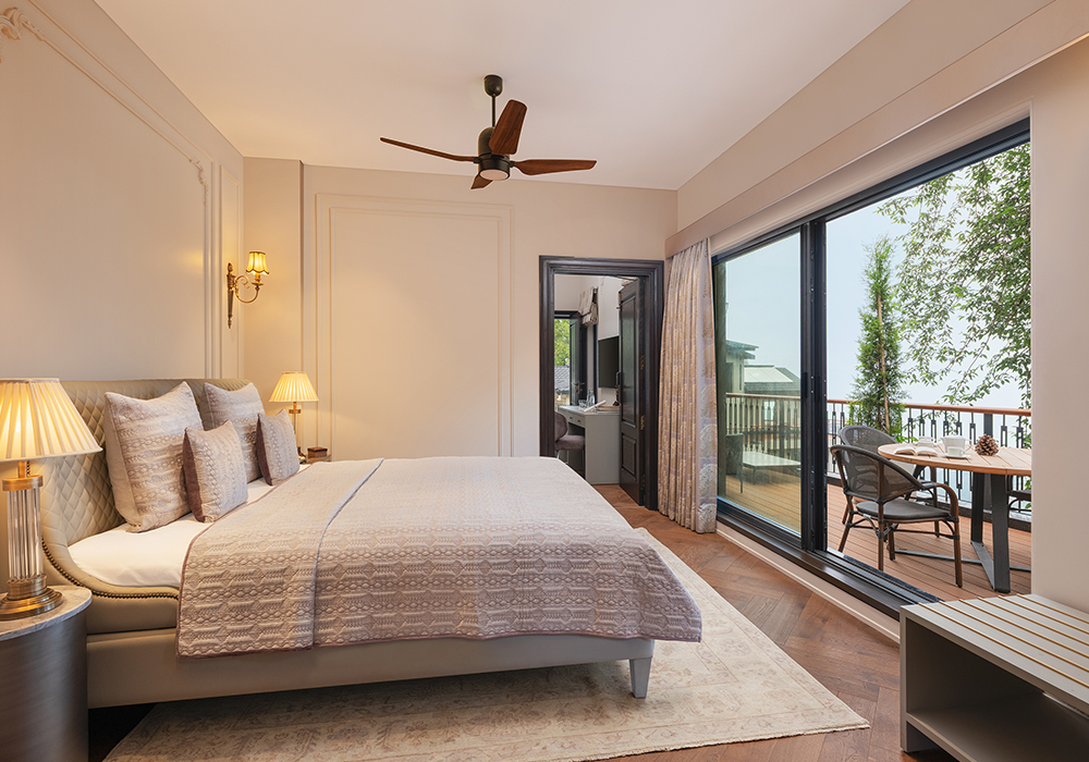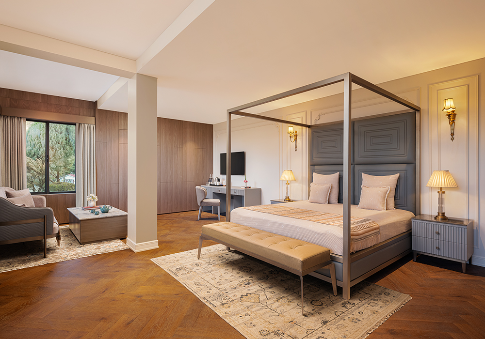 A refined 300 sq. ft. retreat with a king-sized bed and views of the mountains and valley, designed for effortless relaxation. Warm interiors, soft textures, and large windows create a soothing, restful ambience.